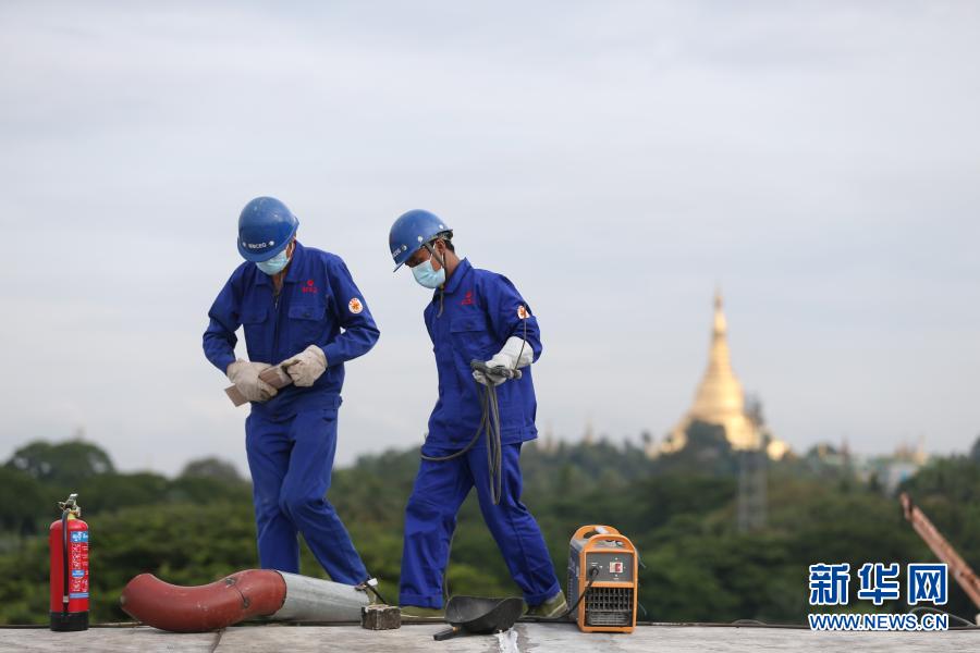 10月28日,在緬甸仰光的國家劇院維修改造項目現(xiàn)場,覺泰昂在師父的指導下焊接鋼管。新華社發(fā)(吳昂攝)