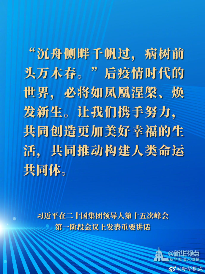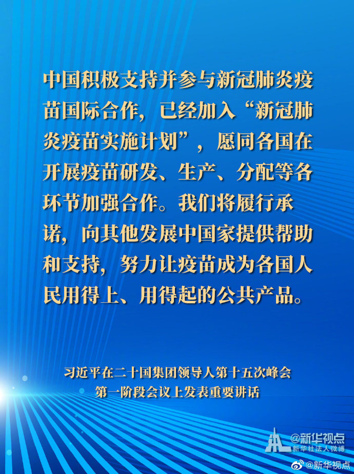 國家主席習(xí)近平21日晚在北京以視頻方式出席二十國集團領(lǐng)導(dǎo)人第十五次峰會第一階段會議并發(fā)表重要講話。以下是講話要點。