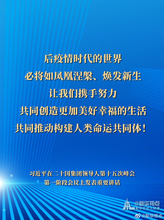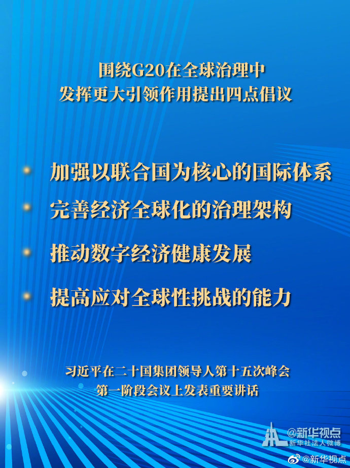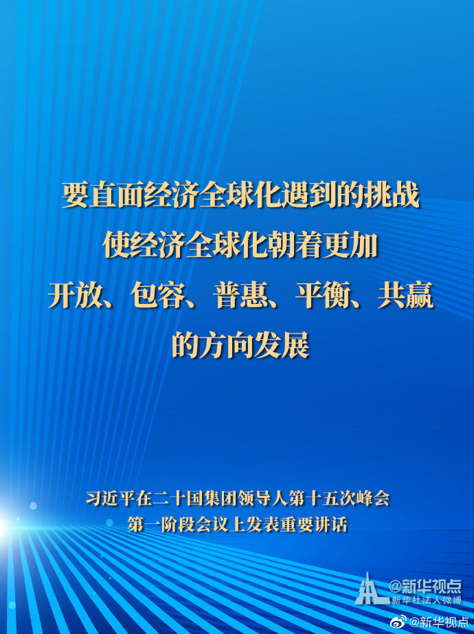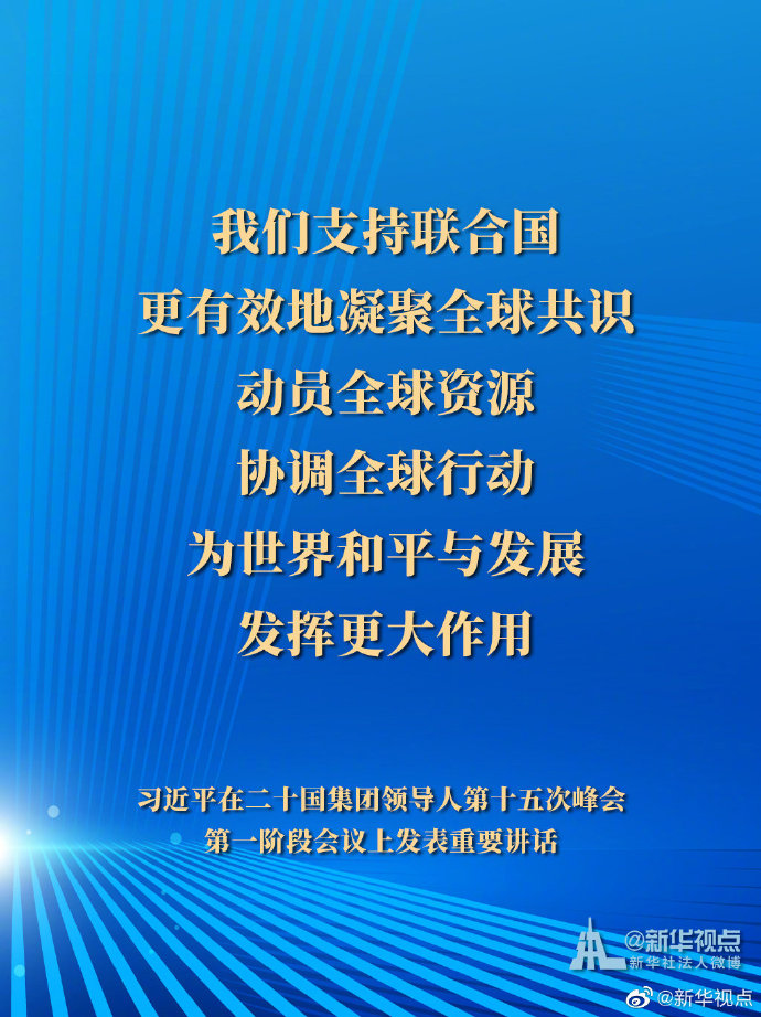 11月21日,國家主席習(xí)近平在二十國集團(tuán)領(lǐng)導(dǎo)人第十五次峰會(huì)第一階段會(huì)議上發(fā)表重要講話。一起來看習(xí)主席的G20金句。