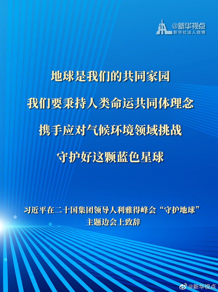 國家主席習(xí)近平11月22日在二十國集團(tuán)領(lǐng)導(dǎo)人利雅得峰會“守護(hù)地球”主題邊會上致辭時表示,地球是我們的共同家園。我們要秉持人類命運(yùn)共同體理念,攜手應(yīng)對氣候環(huán)境領(lǐng)域挑戰(zhàn),守護(hù)好這顆藍(lán)色星球。