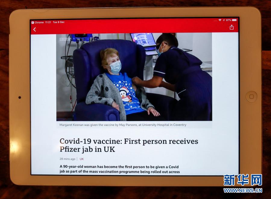 12月8日在英國倫敦拍攝的播放新聞的電腦屏幕顯示,醫(yī)護(hù)人員為90歲女子瑪格麗特·基南接種疫苗。瑪格麗特·基南是該國首位接種新冠疫苗的人。