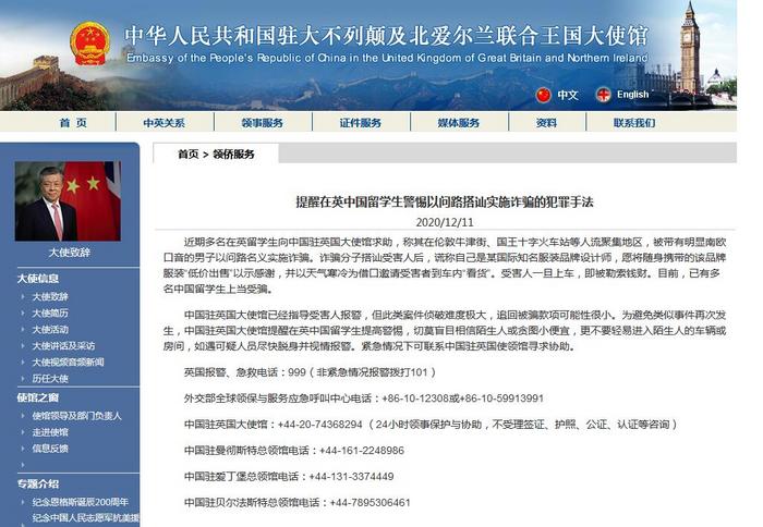 中國(guó)駐英國(guó)大使館已經(jīng)指導(dǎo)受害人報(bào)警,但此類(lèi)案件偵破難度極大,追回被騙款項(xiàng)可能性很小。為避免類(lèi)似事件再次發(fā)生,中國(guó)駐英國(guó)大使館提醒在英中國(guó)留學(xué)生提高警惕,切莫盲目相信陌生人或貪圖小便宜,更不要輕易進(jìn)入陌生人的車(chē)輛或房間,如遇可疑人員盡快脫身并視情報(bào)警。緊急情況下可聯(lián)系中國(guó)駐英國(guó)使領(lǐng)館尋求協(xié)助。