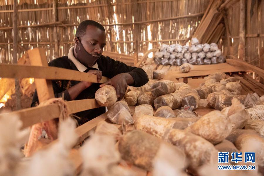 9月9日,在盧旺達首都基加利,埃馬紐埃爾·阿希馬納收獲食用菌。新華社發(fā)(西里爾·恩德格亞攝)