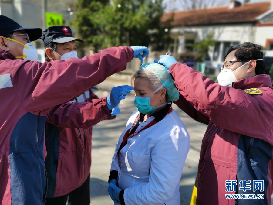 4月4日,中國(guó)赴塞爾維亞抗疫醫(yī)療專家組在貝爾格萊德的基層發(fā)熱門(mén)診走訪時(shí),幫助塞爾維亞醫(yī)生特里富諾維奇(中)佩戴高標(biāo)準(zhǔn)的防護(hù)口罩。新華社發(fā)