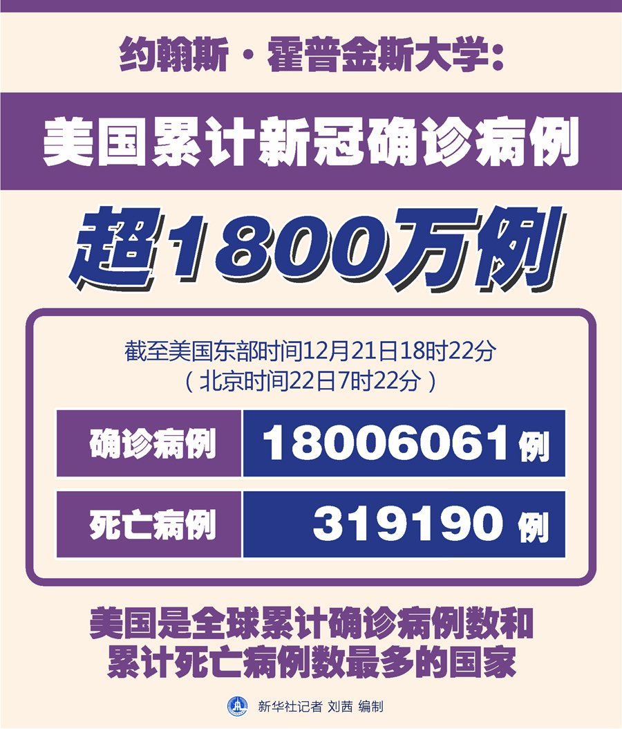 新華社紐約12月21日電 美國(guó)約翰斯·霍普金斯大學(xué)21日發(fā)布的新冠疫情最新統(tǒng)計(jì)數(shù)據(jù)顯示,美國(guó)累計(jì)確診病例超過1800萬(wàn)例。