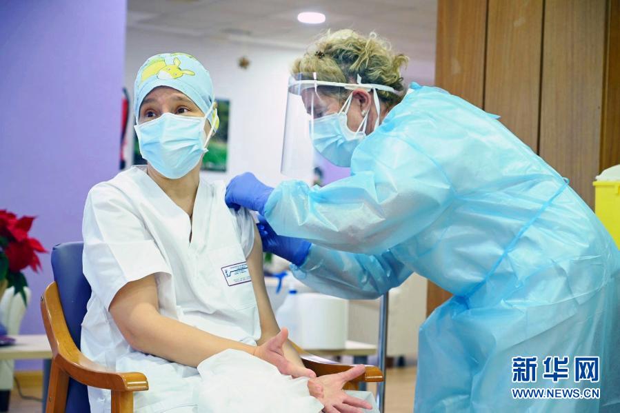 12月27日,護(hù)工莫妮卡·塔皮亞斯(左)在西班牙瓜達(dá)拉哈拉的洛斯奧爾莫斯養(yǎng)老院內(nèi)接受新冠疫苗注射。