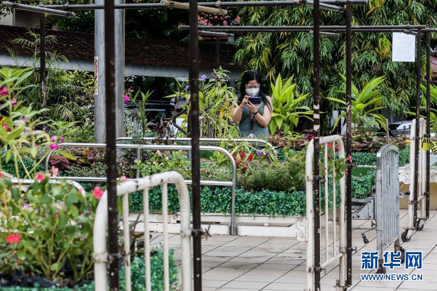 3月18日,在位于馬尼拉的菲律賓大學附屬菲律賓總醫(yī)院,一名女子為“低語的花床”藝術(shù)裝置拍照。