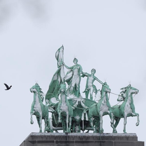 4月7日,比利時(shí)布魯塞爾五十周年紀(jì)念公園中央拱門上的雕塑被積雪覆蓋。