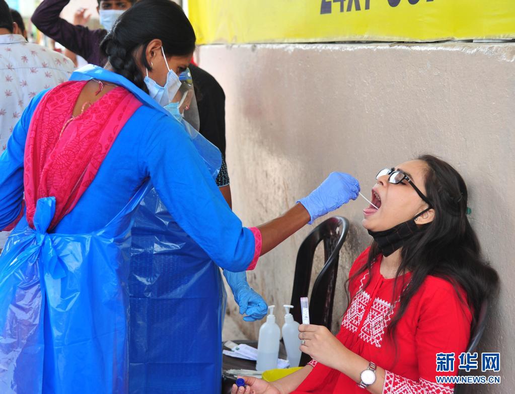 4月11日,一名女子在印度班加羅爾的一個公交站接受新冠病毒檢測取樣。
