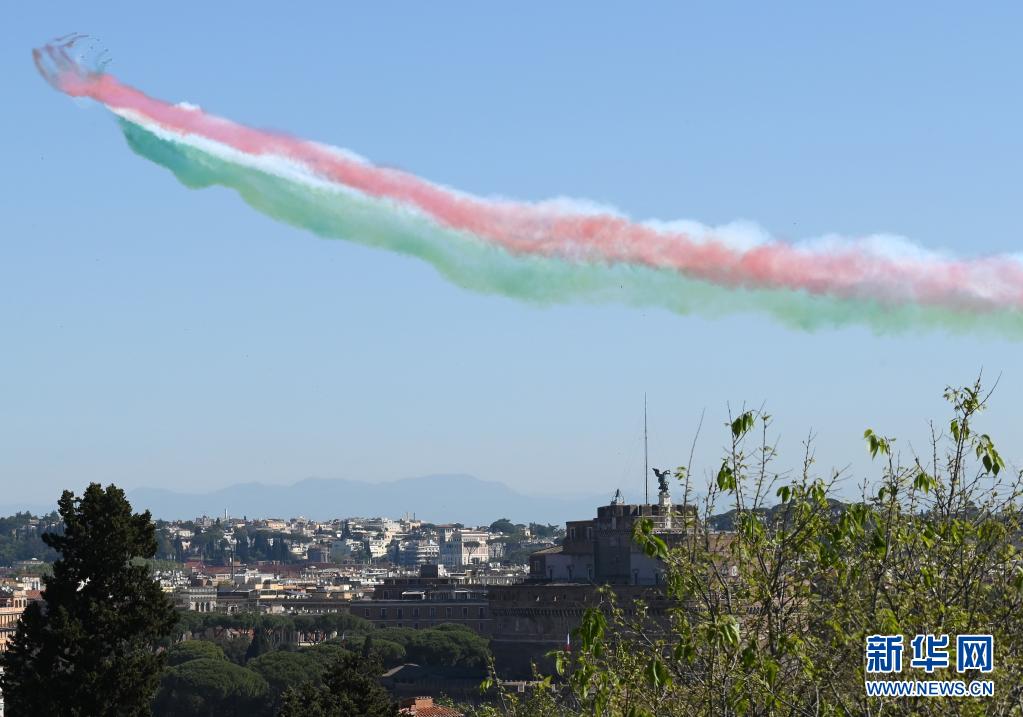 4月25日,意大利“三色箭”飛行表演隊(duì)在羅馬舉行的紀(jì)念儀式上噴出代表意大利國旗顏色的紅白綠三色煙霧。
