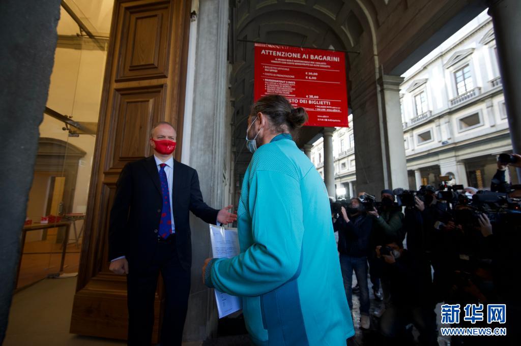 5月4日,在意大利佛羅倫薩,烏菲齊美術(shù)館館長(zhǎng)施密特(左)在重新開(kāi)放的美術(shù)館門(mén)口迎接參觀者。當(dāng)日,意大利烏菲齊美術(shù)館重新開(kāi)放。美術(shù)館改建了售票處和接待處,以避免排隊(duì),并開(kāi)設(shè)了十四個(gè)新展室。新華社發(fā)