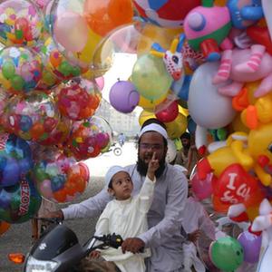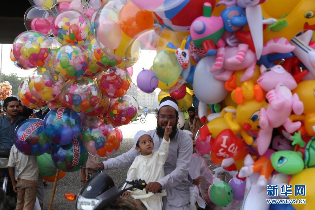5月13日,人們在巴基斯坦南部城市卡拉奇慶祝開齋節(jié)。新華社發(fā)