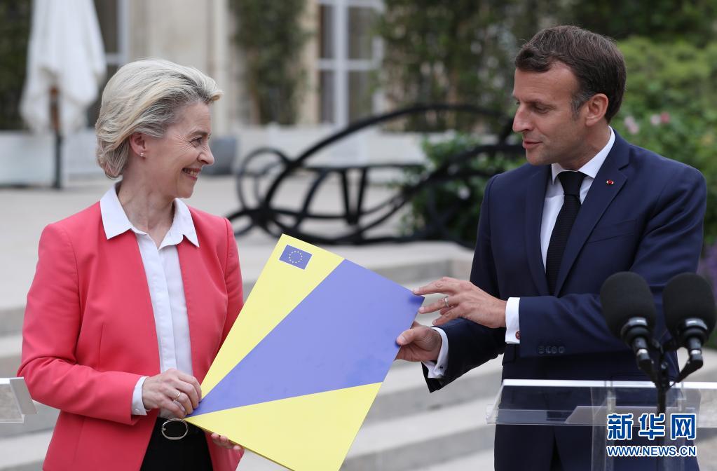6月23日,法國(guó)總統(tǒng)馬克龍(右)與歐盟委員會(huì)主席馮德萊恩在巴黎總統(tǒng)府愛麗舍宮出席新聞發(fā)布會(huì)。