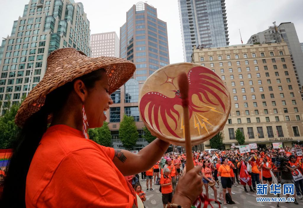 當(dāng)天是加拿大日,上千名抗議者在溫哥華集會,悼念加拿大在強制“同化”原住民過程中遭到殘害的兒童,呼吁取消加拿大日的慶?;顒?。