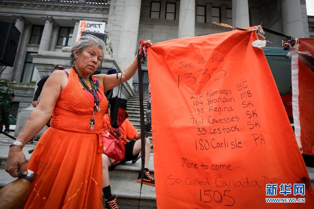 7月1日,原住民社團成員在加拿大溫哥華舉行的集會上展示近期加拿大多地發(fā)現(xiàn)原住民兒童遺骸的清單。